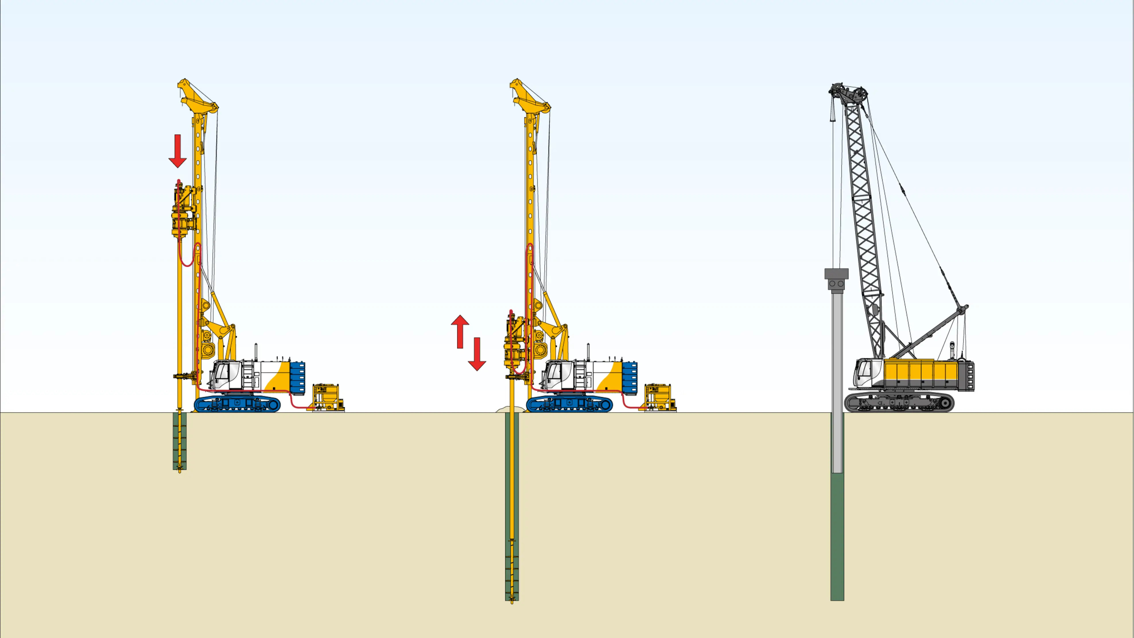 For Single Column Mixing (SCM), the single mixer – a mixing paddle with starter auger – is inserted into the soil. This mixes the embedded soil with a binding agent that is injected at the same time as insertion. The binding agent can be prepared on the mixing tool in dry or slurry form. The method is principally used in loose, non-cohesive soils as a soil improvement measure.